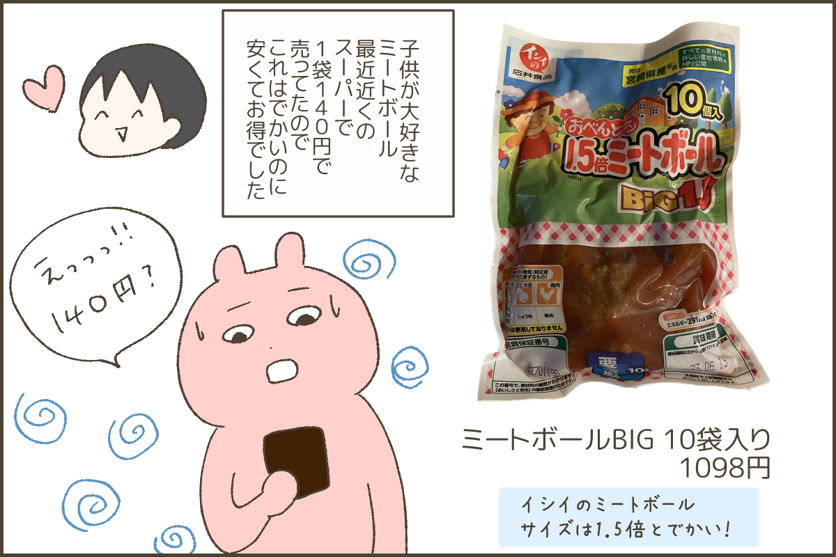 最近近くのスーパーでミートボールが1袋140円で売ってて高くて涙目だったので、BIGで1袋109円は安い~!